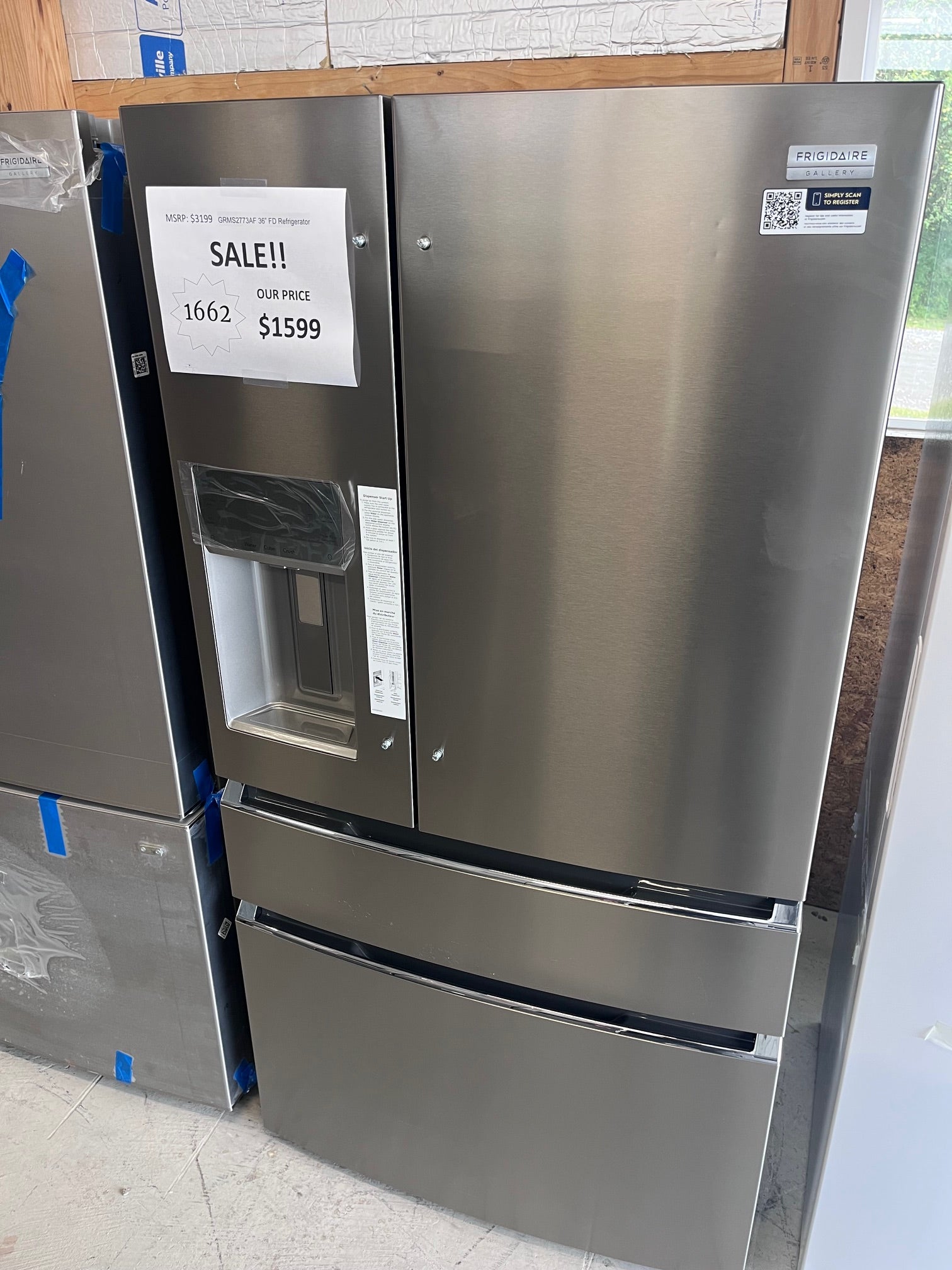 #1662- Frigidaire Gallery 36" Standard-Depth 26.3-cu ft 4 -Door French Door Refrigerator with Ice Maker with Water and Ice Dispenser ( Fingerprint Resistant Stainless Steel )